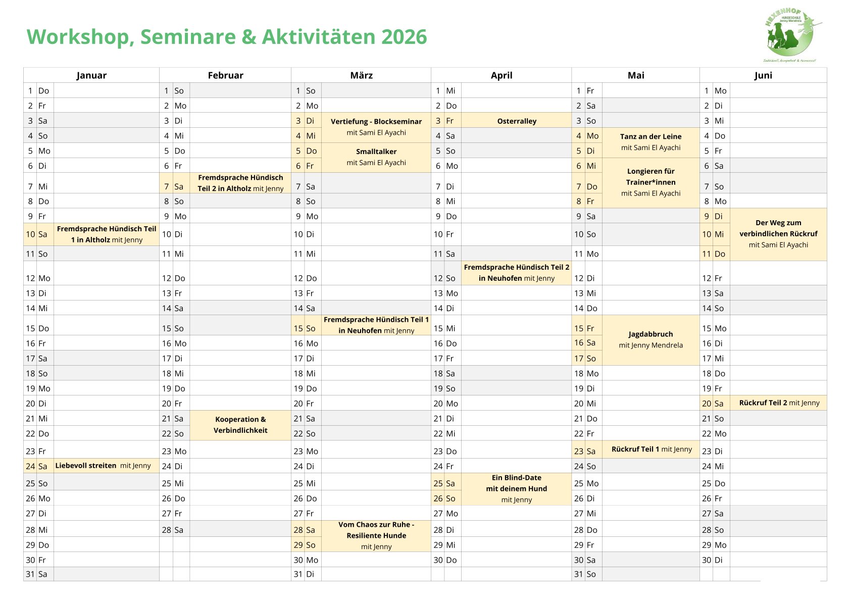 Jahreskalender mit allen wichtigen Terminen rund um den Hexenhof